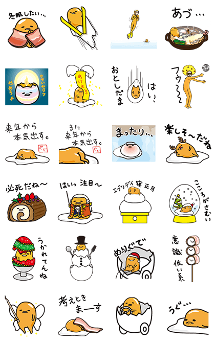 gudetama releases his fifth set of stickers complete with new animations and sound! Get your sloth on this winter with these egg-splosively deadpan puns! Available till February 13, 2016.